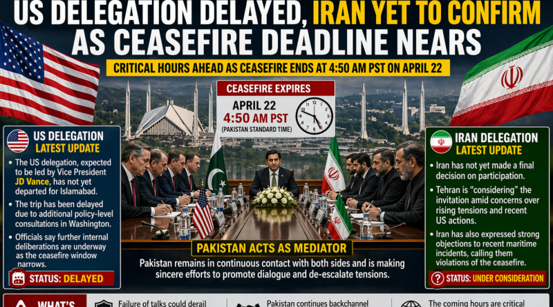 Read MoreHigh-Stakes Diplomacy in Islamabad: US Delegation Delayed, Iran Yet to Confirm as Ceasefire Deadline Nears Islamabad (News Desk): As the