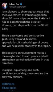 In this context, Iran has now permitted 20 Pakistani-flagged ships to transit, with only two vessels allowed to cross daily. Similar limited crossings for a few other ships were also reported in recent days.